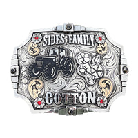 The Cotton Buckle is an antique German silver buckle with a new take on some of the original cowboy belt buckles. This custom buckle has a very unique look, and the custom brand can be changed to whatever you need. The traditional look of this buckle will catch your eye and is a great way to show off someone’s hard work, achievement, or personalization. This buckle measures 3.5" inches tall by 4.5" inches wide. The back of the buckle has a hook for your belt hole. It also has a swivel bar to attach to your belt.