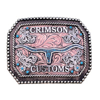 The Crimson Buckle is an antique German silver buckle with a new take on some of the original cowboy belt buckles. This custom buckle has a very unique look, and the custom brand can be changed to whatever you need. The traditional look of this buckle will catch your eye and is a great way to show off someone’s hard work, achievement, or personalization. This buckle measures 3.5" inches tall by 4.5" inches wide. The back of the buckle has a hook for your belt hole. It also has a swivel bar to attach to your belt.