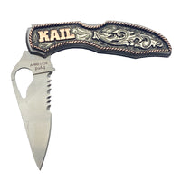 This knife is made out of the high grade stainless steel for its sleek finish. We then add engraved metal with colors like copper, brass, gold and silver to build a knife that is truly one of a kind, every time.  The half serrated, half straight blade is just a snap away from using.
