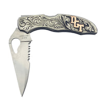 This knife is made out of the high grade stainless steel for its sleek finish. We then add engraved metal with colors like copper, brass, gold and silver to build a knife that is truly one of a kind, every time. The half serrated, half straight blade is just a snap away from using.