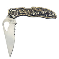 This knife is made out of the high grade stainless steel for its sleek finish. We then add engraved metal with colors like copper, brass, gold and silver to build a knife that is truly one of a kind, every time. The half serrated, half straight blade is just a snap away from using.