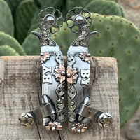 Design yourself a new set of spurs from Sheridan Buckle. We can make you a custom set of spurs with your name, brand, or championship wording and incorporate the engraving to make a piece of art for you. Sheridan Buckle offers the coolest and sturdiest line of spurs that you will be using for years to come. These spurs are sold in a pair of two (left and right foot). Feel free to use the form to tell us how we can customize this pair of spurs for you with initials, brand or logo, name, or just with pretty design work on them.