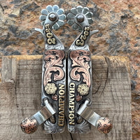 Design yourself a new set of spurs from Sheridan Buckle. We can make you a custom set of spurs with your name, brand, or championship wording and incorporate the engraving to make a piece of art for you. Sheridan Buckle offers the coolest and sturdiest line of spurs that you will be using for years to come. These spurs are sold in a pair of two (left and right foot). Feel free to use the form to tell us how we can customize this pair of spurs for you with initials, brand or logo, name, or just with pretty design work on them.