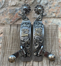 Design yourself a new set of spurs from Sheridan Buckle. We can make you a custom set of spurs with your name, brand, or championship wording and incorporate the engraving to make a piece of art for you. Sheridan Buckle offers the coolest and sturdiest line of spurs that you will be using for years to come. These spurs are sold in a pair of two (left and right foot). Feel free to use the form to tell us how we can customize this pair of spurs for you with initials, brand or logo, name, or just with pretty design work on them.