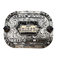 The Dallas Buckle is an antique German silver buckle with bigger stones on edge to encase the custom lettering. This custom trophy buckle has a very unique look, and the custom lettering can be changed to whatever you need. The matte and shiny features look of this buckle will catch your eye and is a great way to show off someone’s hard work, achievement, or personalization. This buckle measures 3.5" inches tall by 4.5" inches wide. The back of the buckle has a hook for your belt hole. It also has a swivel bar to attach to your belt.
