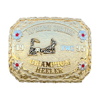 Belt buckles are a great way to advertise or show an achievement, or to personalize one for yourself. This buckle is only an example of how this buckle looks. Your buckle will be made to your specifications, lettering, stone color, etc. For example, if you see a team roper as a figurine and you would like a barrel racer, this will be changed to fit your needs. That goes for the lettering also; whatever lettering you see on the buckle is just an example and will be changed to the lettering you want.
