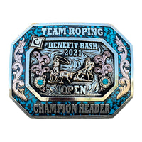 Belt buckles are a great way to advertise or show an achievement, or to personalize one for yourself. This buckle is only an example of how this buckle looks. Your buckle will be made to your specifications, lettering, stone color, etc. For example, if you see a team roper as a figurine and you would like a barrel racer, this will be changed to fit your needs. That goes for the lettering also; whatever lettering you see on the buckle is just an example and will be changed to the lettering you want.