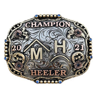 Belt buckles are a great way to advertise or show an achievement, or to personalize one for yourself. This buckle is only an example of how this buckle looks. Your buckle will be made to your specifications, lettering, stone color, etc. For example, if you see a team roper as a figurine and you would like a barrel racer, this will be changed to fit your needs. That goes for the lettering also; whatever lettering you see on the buckle is just an example and will be changed to the lettering you want.
