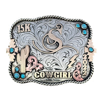Belt buckles are a great way to advertise or show an achievement, or to personalize one for yourself. This buckle is only an example of how this buckle looks. Your buckle will be made to your specifications, lettering, stone color, etc. For example, if you see a team roper as a figurine and you would like a barrel racer, this will be changed to fit your needs. That goes for the lettering also; whatever lettering you see on the buckle is just an example and will be changed to the lettering you want.