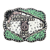 Belt buckles are a great way to advertise or show an achievement, or to personalize one for yourself. This buckle is only an example of how this buckle looks. Your buckle will be made to your specifications, lettering, stone color, etc. For example, if you see a team roper as a figurine and you would like a barrel racer, this will be changed to fit your needs. That goes for the lettering also; whatever lettering you see on the buckle is just an example and will be changed to the lettering you want.
