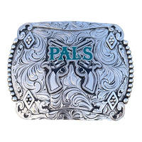 The Douglas Buckle is a square silver plated buckle that looks awesome with its Gold Initials . This custom buckle has a very unique look, and the custom lettering can be changed to whatever you need. The shimmer of this buckle will catch your eye and is a great way to show off someone’s hard work, achievement, or personalization. This buckle measures 3.5" inches tall by 4.5" inches wide. The back of the buckle has a hook for your belt hole. It also has a swivel bar to attach to your belt.