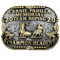 Belt buckles are a great way to advertise or show an achievement, or to personalize one for yourself. This buckle is only an example of how this buckle looks. Your buckle will be made to your specifications, lettering, stone color, etc. For example, if you see a team roper as a figurine and you would like a barrel racer, this will be changed to fit your needs. That goes for the lettering also; whatever lettering you see on the buckle is just an example and will be changed to the lettering you want.