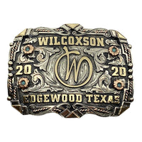 The Edgewood personal belt buckle is a square style buckle with a cool design around the border. The stone colors can be changed out to other colors if you would like, just tell us in our buckle customization form. The custom lettering can be changed to whatever you need as well. The design of this buckle is an eye catcher and is a great way to show off someone’s hard work, achievement, or personalization. This buckle measures 3.5" inches tall by 4.5" inches wide. The back of the buckle has a hook for your belt hole. It also has a swivel bar to attach to your belt.