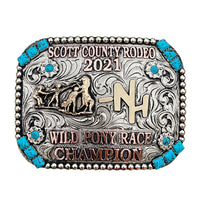 The Edmond is a Square silver plated buckle that looks awesome with its Turquoise stones. This custom trophy buckle has a very unique look, and the custom lettering can be changed to whatever you need. The shimmer of this buckle will catch your eye and is a great way to show off someone’s hard work, achievement, or personalization. This buckle measures 3.5" inches tall by 4.5" inches wide. The back of the buckle has a hook for your belt hole. It also has a swivel bar to attach to your belt.