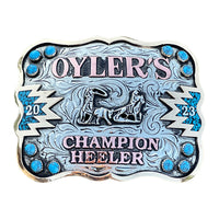 Belt buckles are a great way to advertise or show an achievement, or to personalize one for yourself. This buckle is only an example of how this buckle looks. Your buckle will be made to your specifications, lettering, stone color, etc. For example, if you see a team roper as a figurine and you would like a barrel racer, this will be changed to fit your needs. That goes for the lettering also; whatever lettering you see on the buckle is just an example and will be changed to the lettering you want.