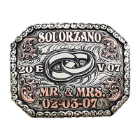 The Engagement Buckle is an antique German silver buckle with a new take on some of the original cowboy belt buckles. This custom trophy buckle has a very unique look, and the custom brand can be changed to whatever you need. The traditional look of this buckle will catch your eye and is a great way to show off someone’s hard work, achievement, or personalization. This buckle measures 3.5" inches tall by 4.5" inches wide. The back of the buckle has a hook for your belt hole. It also has a swivel bar to attach to your belt.
