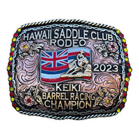 The Enis Buckle is a unique shaped Silver plated buckle that looks awesome with its beautiful Bead and rope border. This custom trophy buckle has a very unique look, and the custom lettering can be changed to whatever you need. The shimmer of this buckle will catch your eye and is a great way to show off someone’s hard work, achievement, or personalization. This buckle measures 3.5" inches tall by 4.5" inches wide. The back of the buckle has a hook for your belt hole. It also has a swivel bar to attach to your belt.