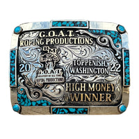 The Enterprise Buckle is a unique shaped silver plated buckle that looks awesome with its beautiful border. This custom trophy buckle has a very unique look, and the custom lettering can be changed to whatever you need. The shimmer of this buckle will catch your eye and is a great way to show off someone’s hard work, achievement, or personalization. This buckle measures 3.5" inches tall by 4.5" inches wide. The back of the buckle has a hook for your belt hole. It also has a swivel bar to attach to your belt.