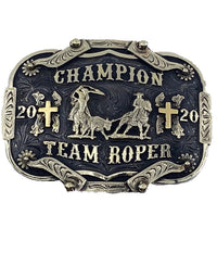 Belt buckles are a great way to advertise or show an achievement, or to personalize one for yourself. This buckle is only an example of how this buckle looks. Your buckle will be made to your specifications, lettering, stone color, etc. For example, if you see a team roper as a figurine and you would like a barrel racer, this will be changed to fit your needs. That goes for the lettering also; whatever lettering you see on the buckle is just an example and will be changed to the lettering you want.