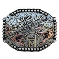 The Farrell Buckle is a unique shaped silver plated buckle that looks awesome with its Brand colors and stonework . This custom buckle has a very unique look, and the custom lettering can be changed to whatever you need. The shimmer of this buckle will catch your eye and is a great way to show off someone’s hard work, achievement, or personalization. This buckle measures 3.5" inches tall by 4.5" inches wide. The back of the buckle has a hook for your belt hole. It also has a swivel bar to attach to your belt.