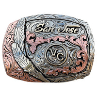 The Flora Buckle is a unique shaped silver plated buckle that looks awesome with its beautiful feathers along the side. This custom trophy buckle has a very unique look, and the custom lettering can be changed to whatever you need. The shimmer of this buckle will catch your eye and is a great way to show off someone’s hard work, achievement, or personalization. This buckle measures 3.5" inches tall by 4.5" inches wide. The back of the buckle has a hook for your belt hole. It also has a swivel bar to attach to your belt.