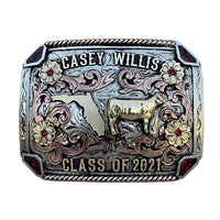 The Florida Graduation Buckle is a unique shaped silver plated buckle that looks awesome with its accents, figurines, and accomplishments in the corners. This custom buckle has a very unique look, and the custom lettering, and figurines can be changed to whatever you need. The shimmer of this buckle will catch your eye and is a great way to show off someone’s hard work, achievement, or personalization. This buckle measures 3.5" inches tall by 4.5" inches wide normally but we have different sizes available. The back of the buckle has a hook for your belt hole. It also has a swivel bar to attach to your belt.