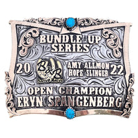 Belt buckles are a great way to advertise or show an achievement, or to personalize one for yourself. This buckle is only an example of how this buckle looks. Your buckle will be made to your specifications, lettering, stone color, etc. For example, if you see a team roper as a figurine and you would like a barrel racer, this will be changed to fit your needs. That goes for the lettering also; whatever lettering you see on the buckle is just an example and will be changed to the lettering you want.