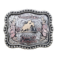 The Formal Buckle is a unique shaped silver plated buckle that looks awesome with its beautiful border. This custom trophy buckle has a very unique look, and the custom lettering can be changed to whatever you need. The shimmer of this buckle will catch your eye and is a great way to show off someone’s hard work, achievement, or personalization. This buckle measures 3.5" inches tall by 4.5" inches wide. The back of the buckle has a hook for your belt hole. It also has a swivel bar to attach to your belt.