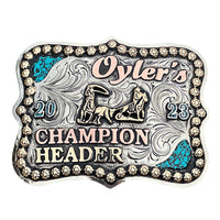 Belt buckles are a great way to advertise or show an achievement, or to personalize one for yourself. This buckle is only an example of how this buckle looks. Your buckle will be made to your specifications, lettering, stone color, etc. For example, if you see a team roper as a figurine and you would like a barrel racer, this will be changed to fit your needs. That goes for the lettering also; whatever lettering you see on the buckle is just an example and will be changed to the lettering you want.