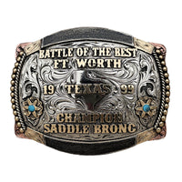 The Ft. Worth Buckle is an antique German silver buckle with a new take on some of the original cowboy belt buckles. This custom trophy buckle has a very unique look, and the custom lettering can be changed to whatever you need. The traditional look of this buckle will catch your eye and is a great way to show off someone’s hard work, achievement, or personalization. This buckle measures 3.5" inches tall by 4.5" inches wide. The back of the buckle has a hook for your belt hole. It also has a swivel bar to attach to your belt.