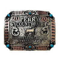 The Fountain Buckle is a unique shaped silver plated buckle that looks awesome with its beautiful border. This custom trophy buckle has a very unique look, and the custom lettering can be changed to whatever you need. The shimmer of this buckle will catch your eye and is a great way to show off someone’s hard work, achievement, or personalization. This buckle measures 3.5" inches tall by 4.5" inches wide. The back of the buckle has a hook for your belt hole. It also has a swivel bar to attach to your belt.
