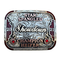The Frisco trophy belt buckle is based around our signature "Crushed Turquoise" stone design. This crushed turquoise buckle looks great on your belt. The stone colors can be changed out to other colors if you would like, just tell us in our buckle customization form. The custom lettering can be changed to whatever you need as well. The design of this buckle is an eye catcher and is a great way to show off someone’s hard work, achievement, or personalization. This buckle measures 3.5" inches tall by 4.5" inches wide. The back of the buckle has a hook for your belt hole. It also has a swivel bar to attach to your belt.