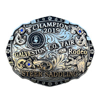 The Galena Buckle is a unique shaped silver plated buckle that looks awesome with its beautiful border. This custom trophy buckle has a very unique look, and the custom lettering can be changed to whatever you need. The shimmer of this buckle will catch your eye and is a great way to show off someone’s hard work, achievement, or personalization. This buckle measures 3.5" inches tall by 4.5" inches wide. The back of the buckle has a hook for your belt hole. It also has a swivel bar to attach to your belt.