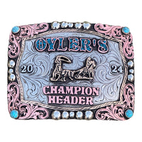 Belt buckles are a great way to advertise or show an achievement, or to personalize one for yourself. This buckle is only an example of how this buckle looks. Your buckle will be made to your specifications, lettering, stone color, etc. For example, if you see a team roper as a figurine and you would like a barrel racer, this will be changed to fit your needs. That goes for the lettering also; whatever lettering you see on the buckle is just an example and will be changed to the lettering you want.