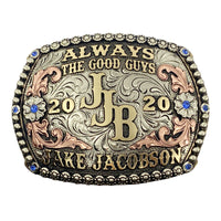 The Good Guy Buckle is a square silver plated buckle that looks awesome with its Blue Stones. This custom buckle has a very unique look, and the custom lettering can be changed to whatever you need. The shimmer of this buckle will catch your eye and is a great way to show off someone’s hard work, achievement, or personalization. This buckle measures 3.5" inches tall by 4.5" inches wide. The back of the buckle has a hook for your belt hole. It also has a swivel bar to attach to your belt.
