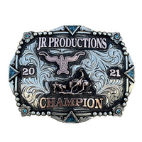 Belt buckles are a great way to advertise or show an achievement, or to personalize one for yourself. This buckle is only an example of how this buckle looks. Your buckle will be made to your specifications, lettering, stone color, etc. For example, if you see a team roper as a figurine and you would like a barrel racer, this will be changed to fit your needs. That goes for the lettering also; whatever lettering you see on the buckle is just an example and will be changed to the lettering you want.