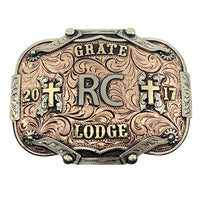 The Grate Buckle is a square silver plated buckle that looks awesome with its Spurs . This custom buckle has a very unique look, and the custom lettering can be changed to whatever you need. The shimmer of this buckle will catch your eye and is a great way to show off someone’s hard work, achievement, or personalization. This buckle measures 3.5" inches tall by 4.5" inches wide. The back of the buckle has a hook for your belt hole. It also has a swivel bar to attach to your belt.