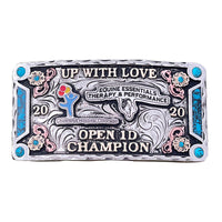 The Grove box trophy belt buckle is based around our signature crushed stone design. The stone colors can be changed out to other colors if you would like, just tell us in our buckle customization form. The custom lettering can be changed to whatever you need as well. The Sheridan box buckle is designed to fit a belt perfect. The sleek look of the box buckle will catch your eye and is a great way to show off someone’s hard work, achievement, or personalization. This buckle measures 2" inches tall by 4" inches wide. The back of the buckle has a hook for your belt hole. It also has a swivel bar to attach to your belt.