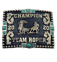Belt buckles are a great way to advertise or show an achievement, or to personalize one for yourself. This buckle is only an example of how this buckle looks. Your buckle will be made to your specifications, lettering, stone color, etc. For example, if you see a team roper as a figurine and you would like a barrel racer, this will be changed to fit your needs. That goes for the lettering also; whatever lettering you see on the buckle is just an example and will be changed to the lettering you want.