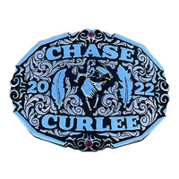 The Gypsum trophy belt buckle is designed to fit a belt perfect. This custom trophy buckle has a very unique look, and the custom lettering can be changed to whatever you need. This buckle will catch your eye and is a great way to show off someone’s hard work, achievement, or personalization. This buckle measures 3.5" inches tall by 4.5" inches wide. The back of the buckle has a hook for your belt hole. It also has a swivel bar to attach to your belt.