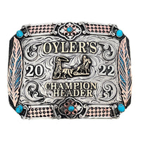 The Harlan Buckle is a unique shaped silver plated buckle that looks awesome with its beautiful border. This custom trophy buckle has a very unique look, and the custom lettering can be changed to whatever you need. The shimmer of this buckle will catch your eye and is a great way to show off someone’s hard work, achievement, or personalization. This buckle measures 3.5" inches tall by 4.5" inches wide. The back of the buckle has a hook for your belt hole. It also has a swivel bar to attach to your belt.