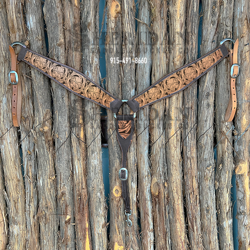 Sheridan provides high quality leather breast collars to finish off your saddle setup. This specific 3-Piece Heavy Duty Breast Collar is meant to give your horse the maximum support while pulling livestock, ranching, competition in the arena, incline and decline trail rides and other athletic activities on your horse. The heavy duty breast collar is designed out of 3 piece of contoured leather secured with a Dee ring in the middle of your horses chest. This allows the leather breast collar to goes in front of your horses chest and secure in-between your horses front legs to give your horse a comfortable and secure brace along his chest to help him while he is performing. This breast collar has 3 connections to your saddle to ensure a good secure fit to any horse. We manufacture breast collars to match our Sheridan Saddles, which will make you and your horse ready to ride while matching your saddle tooling and setup as well. Each Sheridan breast collar is handmade and hand tooled to match your saddle with the same quality craftsmanship you have been used to. We can match the tooling of your Sheridan Saddle, add custom lettering, add trophy lettering to any of our breast collars.
