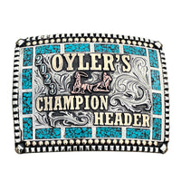 The Hewitt Buckle is a unique shaped silver plated buckle that looks awesome with its beautiful border. This custom trophy buckle has a very unique look, and the custom lettering can be changed to whatever you need. The shimmer of this buckle will catch your eye and is a great way to show off someone’s hard work, achievement, or personalization. This buckle measures 3.5" inches tall by 4.5" inches wide. The back of the buckle has a hook for your belt hole. It also has a swivel bar to attach to your belt.