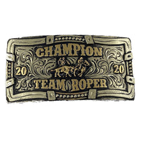 Belt buckles are a great way to advertise or show an achievement, or to personalize one for yourself. This buckle is only an example of how this buckle looks. Your buckle will be made to your specifications, lettering, stone color, etc. For example, if you see a team roper as a figurine and you would like a barrel racer, this will be changed to fit your needs. That goes for the lettering also; whatever lettering you see on the buckle is just an example and will be changed to the lettering you want.