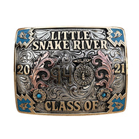The Idaho Graduation Buckle is a unique shaped silver plated buckle that looks awesome with its accents, figurines, and accomplishments in the corners. This custom buckle has a very unique look, and the custom lettering, and figurines can be changed to whatever you need. The shimmer of this buckle will catch your eye and is a great way to show off someone’s hard work, achievement, or personalization. This buckle measures 3.5" inches tall by 4.5" inches wide normally but we have different sizes available. The back of the buckle has a hook for your belt hole. It also has a swivel bar to attach to your belt.