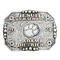 The Jesuit Class Buckle is a unique shaped silver plated buckle that looks awesome with its accents, figurines, and accomplishments in the corners. This custom buckle has a very unique look, and the custom lettering, and figurines can be changed to whatever you need. The shimmer of this buckle will catch your eye and is a great way to show off someone’s hard work, achievement, or personalization. This buckle measures 3.5" inches tall by 4.5" inches wide normally but we have different sizes available. The back of the buckle has a hook for your belt hole. It also has a swivel bar to attach to your belt.