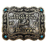 The Joplin trophy belt buckle is a unique shaped antique silver buckle and designed to fit a belt perfect. This custom trophy buckle has a very unique look, and the custom lettering can be changed to whatever you need. The engraving will catch your eye and is a great way to show off someone’s hard work, achievement, or personalization. This buckle measures 3.5" inches tall by 4.5" inches wide. The back of the buckle has a hook for your belt hole. It also has a swivel bar to attach to your belt.