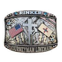 The Journeyman Buckle is a unique shaped silver plated buckle that looks awesome with its design . This custom buckle has a very unique look, and the custom lettering can be changed to whatever you need. The shimmer of this buckle will catch your eye and is a great way to show off someone’s hard work, achievement, or personalization. This buckle measures 3.5" inches tall by 4.5" inches wide. The back of the buckle has a hook for your belt hole. It also has a swivel bar to attach to your belt.