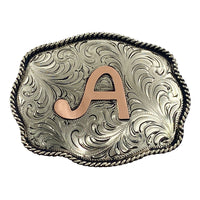 The Julian Buckle is a Square silver plated buckle that looks awesome with its Copper Brand. We can change this out to your information . This custom buckle has a very unique look, and the custom lettering can be changed to whatever you need. The shimmer of this buckle will catch your eye and is a great way to show off someone’s hard work, achievement, or personalization. This buckle measures 3.5" inches tall by 4.5" inches wide. The back of the buckle has a hook for your belt hole. It also has a swivel bar to attach to your belt.