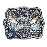 The Kelso Buckle is a unique shaped silver plated buckle that looks awesome with its beautiful border. This custom trophy buckle has a very unique look, and the custom lettering can be changed to whatever you need. The shimmer of this buckle will catch your eye and is a great way to show off someone’s hard work, achievement, or personalization. This buckle measures 3.5" inches tall by 4.5" inches wide. The back of the buckle has a hook for your belt hole. It also has a swivel bar to attach to your belt.